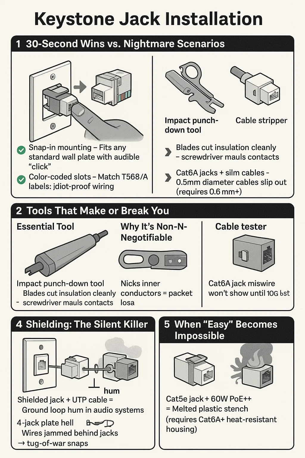 Instant Fail laquei: * Cable conatus destitutis - IDC laminae filis concidit subductis (solidum-core solum!). * Cat6A Jacks retinacula gracili - 0.5mm diametri elabi (requirit 0.6mm).