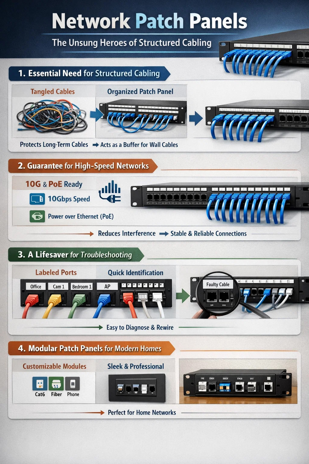 Attamen in inceptis professionalibus cabling, centra data, et etiam in renovationibus magnis retis requirendis, tabulata network panni rudis manet necessaria "core component."