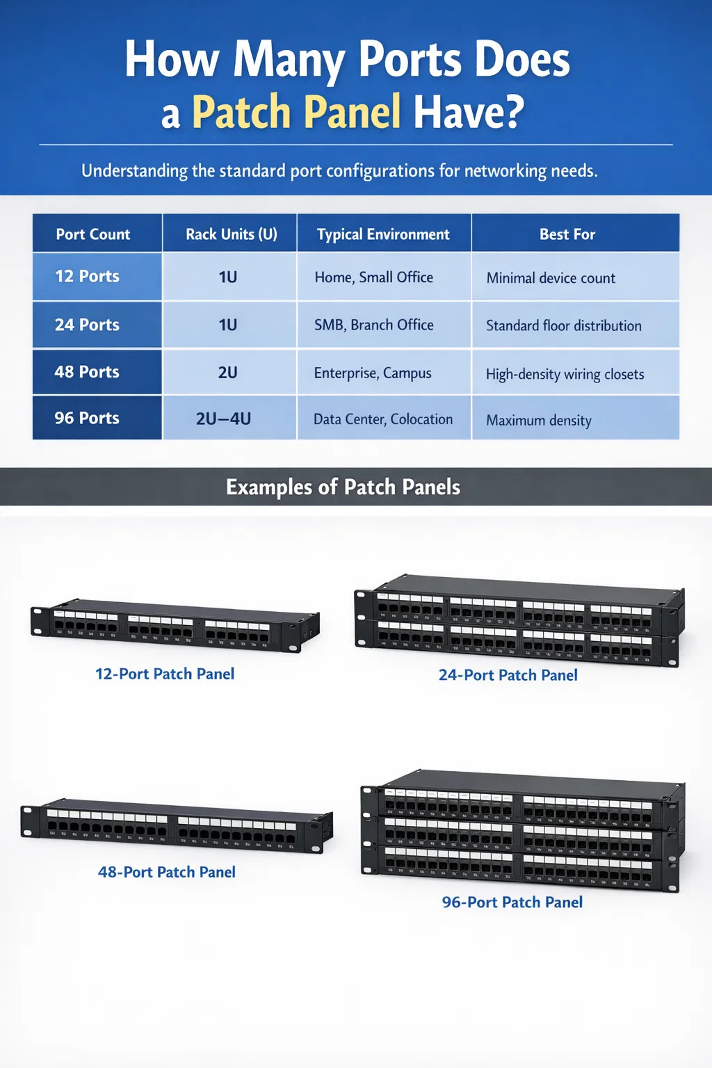 | 96-port | 2U-4U | Data centrum, colocation | Maximum densum, servo rura |
