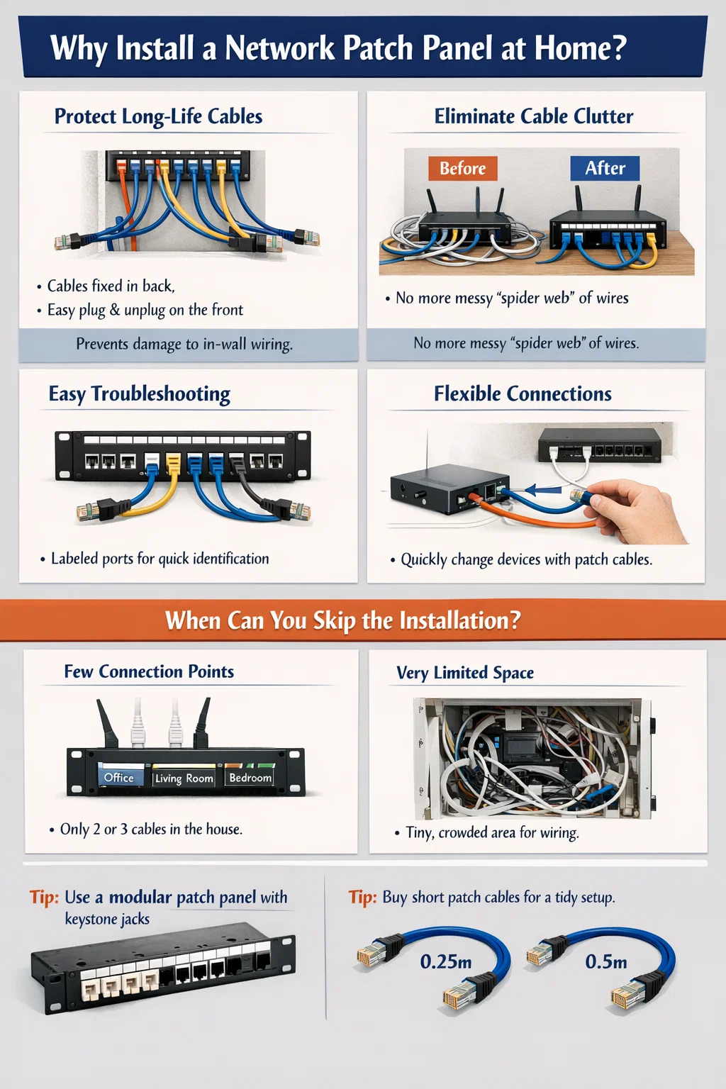 Utrum install a? network panni rudis panel in domo tua pendet ex requisitis tuis pro retis "concinnitate" et "longi temporis consilio." Dum multae domus renovationes solum involvunt funiculos retis e muro trahentes et in connexiones obliquantes, addito tabula panni rudimenta signanter emendare domum retis tuis possunt.