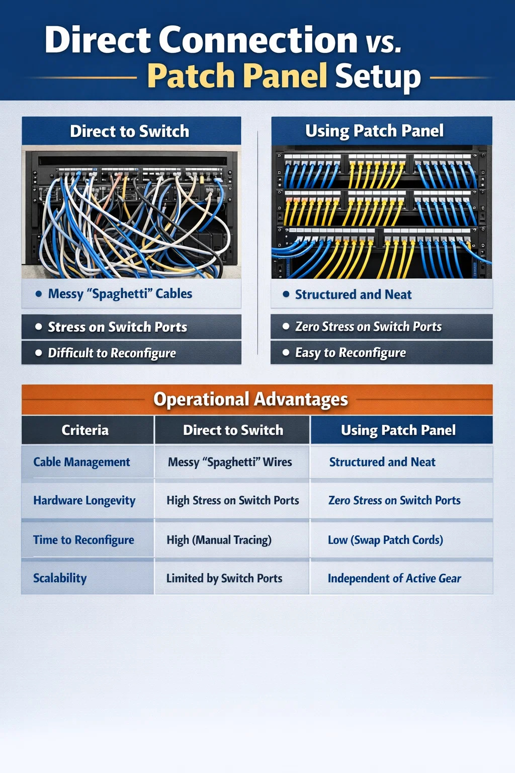 Tu pugnes cum a network panni rudis panel quia sicut pons criticus inter rigidos, permanentes wiring intra muros tuos et electronicas activas in servo tuo eculeo agit. Sine ea, damna corporis tui funibus periclitaris, contiones "spaghetti" wiring conportatoria quae impossibilia efficiunt, perdis et facultatem amittes ut facile reticulum tuum reconfigures. Mutat fasciculum conglobatum filiorum in systema professionalem, intitulatum et scalabile, quod ferramentaria obsidionem tuetur.